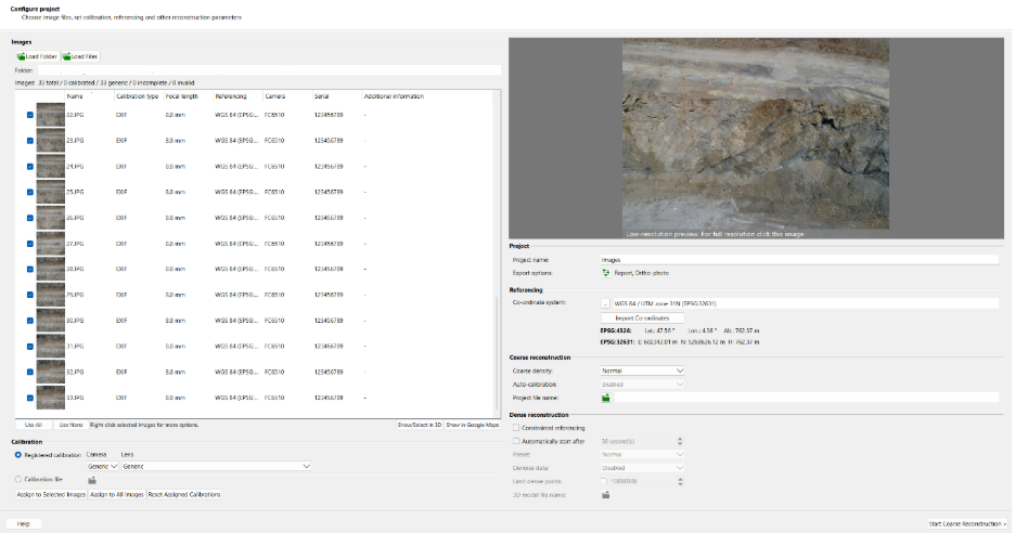 This example features 33 overlapping aerial images, taken from 4 rows in accordance with the 80% overlap and image quality suggestions, also presented in ShapeMetriX Field Procedures user guide. As shown below, load the images into MultiPhoto for the initial step of 3D model generation pipeline – Coarse Reconstruction.
