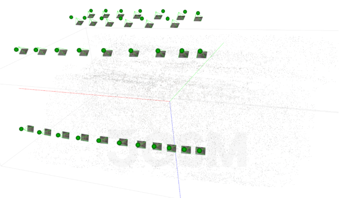 This step establishes the relative orientations and positions of the cameras, mapping the general structure of the scene to a coarse 3D point cloud.