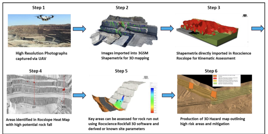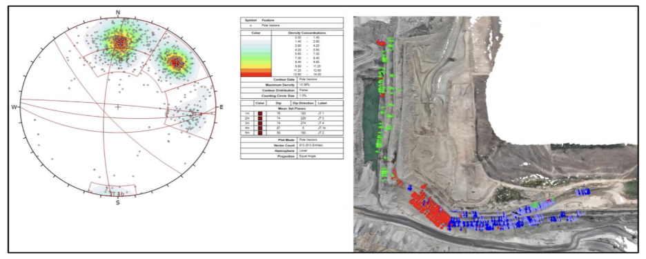 A UAV survey of the 5 km pit slope (Step 1) was completed in roughly two hours. The images were processed in ShapeMetriX (Step 2), generating a georeferenced 3D model of the highwalls and mapping 813 discontinuities.