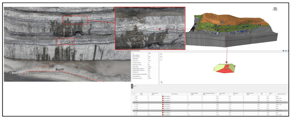 After the initial mapping of discontinuities, the georeferenced data and topographic and underlying geology surfaces were imported into RocSlope3 for block stability analysis (Steps 3 and 4). Most pseudo-stable blocks were identified on the northern highwall. Comparison of analysis results to known rockfall hazards yielded new areas of potential failure. The largest block (115m3) from the analysis was on the second bench crest above the pit floor on the northern highwall and is shown below overlain with a photo of the pit.