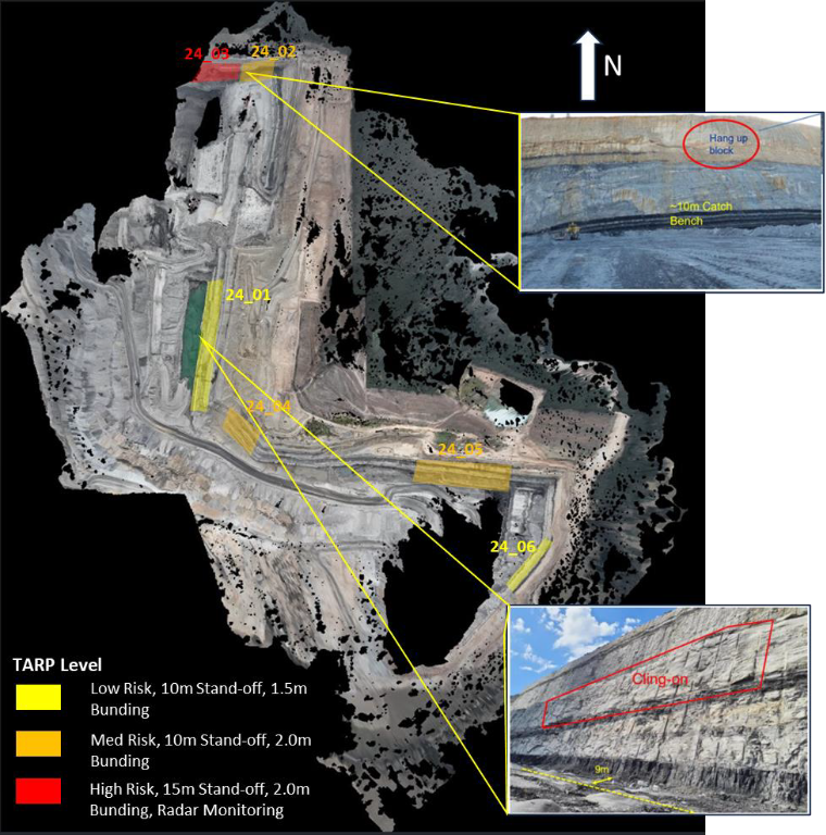 The 3D kinematic assessment identified priority areas for hazard mitigation, such as the placement of rockfall bunds, implementation of slope monitoring, and targeted inspections. This approach was applied at multiple locations across the mine, with outcomes presented as a hazard map that included recommended controls tailored to the activities underway at each site. Hazard zones were then assigned a Trigger Action Response Plan (TARP) level based on the residual operational risk (Figure 6).