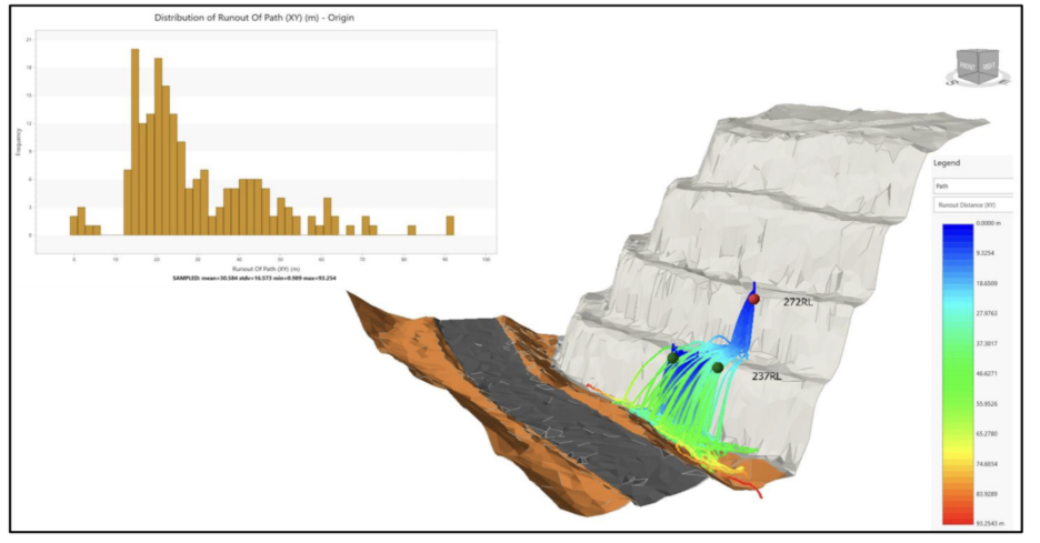 The output from the RocFall3 analysis is shown below, with a mean runout distance of about 30m. Using the analysis outputs, an effective earth bund was constructed to act as a rockfall barrier and reduce the associated hazard. In parallel, a slope stability radar was installed to track wall deformation, with its scan area specifically defined based on the kinematic hotspot map results.